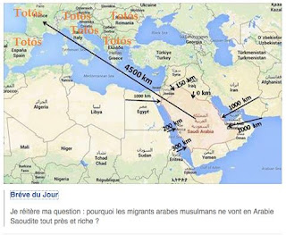 A figura abaixo mostra bem o fato curioso de que os "refugiados" poderiam muito bem buscar refúgio nos ricos países do Golfo, mais próximos geograficamente, culturalmente e religiosamente. Porque eles não fazem isso?
