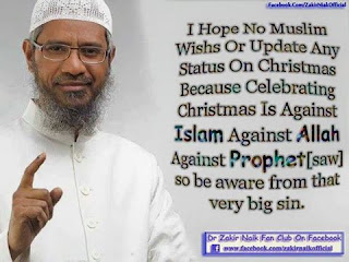 O imã Zakir Naik, um famoso pregador islâmico da Indonésia, chega a afirmar, na sua fã-page do Facebook, que "eu espero que muçulmano algum deseje ou atualize o seu status [no Facebook] sobre o Natal porque celebrar o Natal é contra o islão, contra Alá, e contra o profeta [Maomé], de modo que fique ciente que isso é um pecado muito grande."