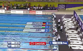 Veja a foto. O segundo colocado é o nadador israelense (judeu) Ivry, mas a TV do Qatar não mostra a bandeira de Israel, mas uma bandeira branca.